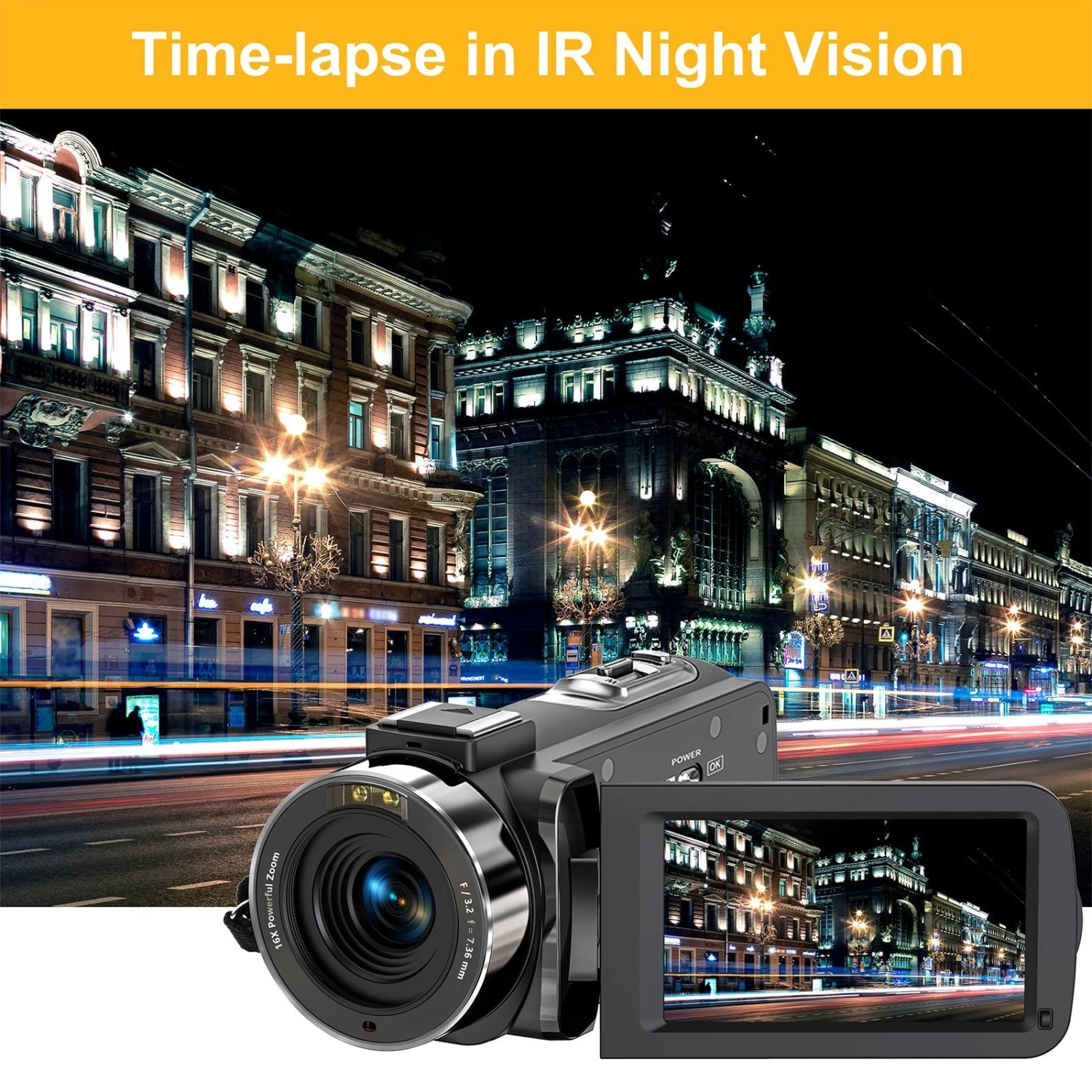 - Practical Functions to Fly Creativity:This video camera offers multiple functions for creator to add more creativity. Slow motion extends the wonderful moment; Burst shooting records serial reaction; Time-lapse condenses progress. IR night vision guarantee picture quality in the dark. Share original film with others.