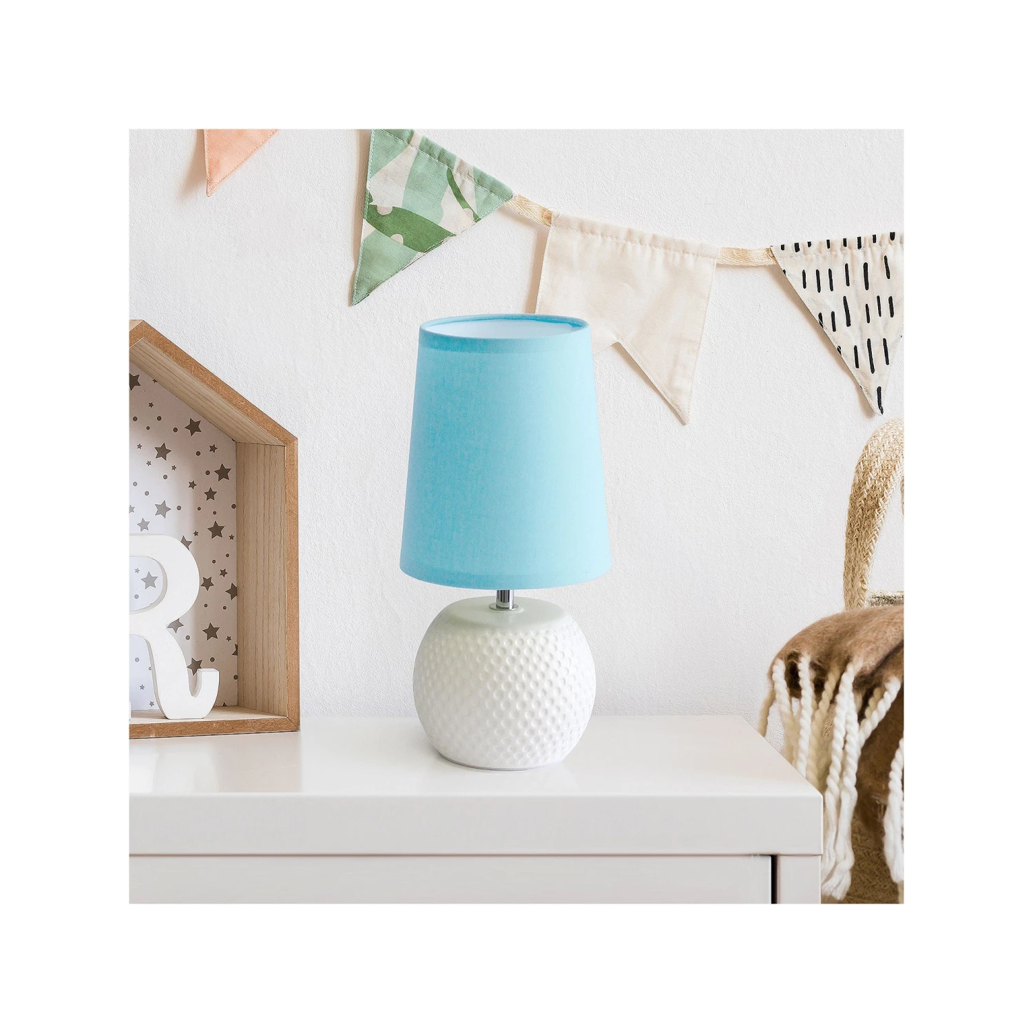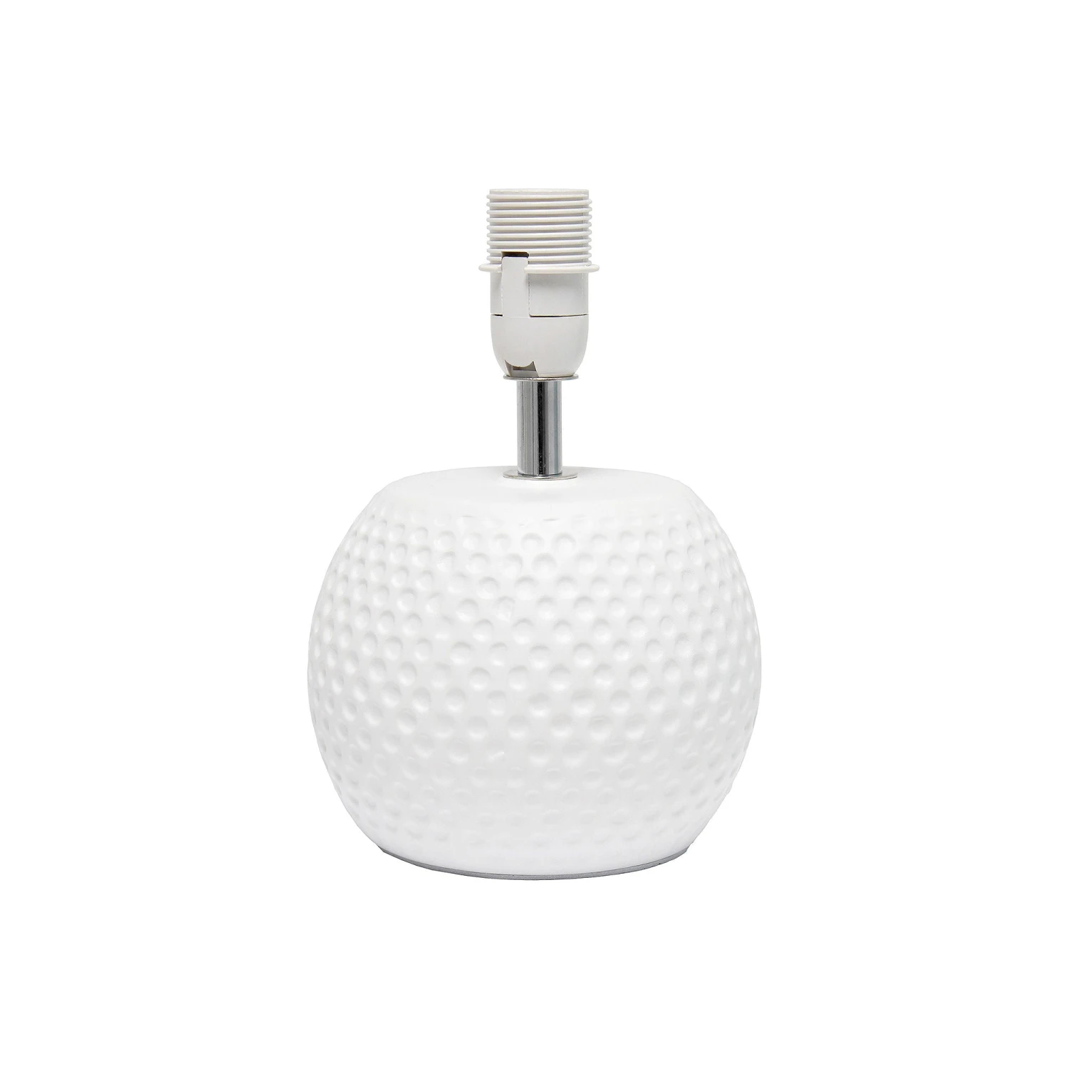 In need of a small, yet cute lamp to sit within a small space. Look no further! A dotted texture on the curved ceramic base, below a colored fabric shade makes this piece easily adaptable to any interior! Add a pop of color with your shade options or keep your lamp neutrally simple in all white.
