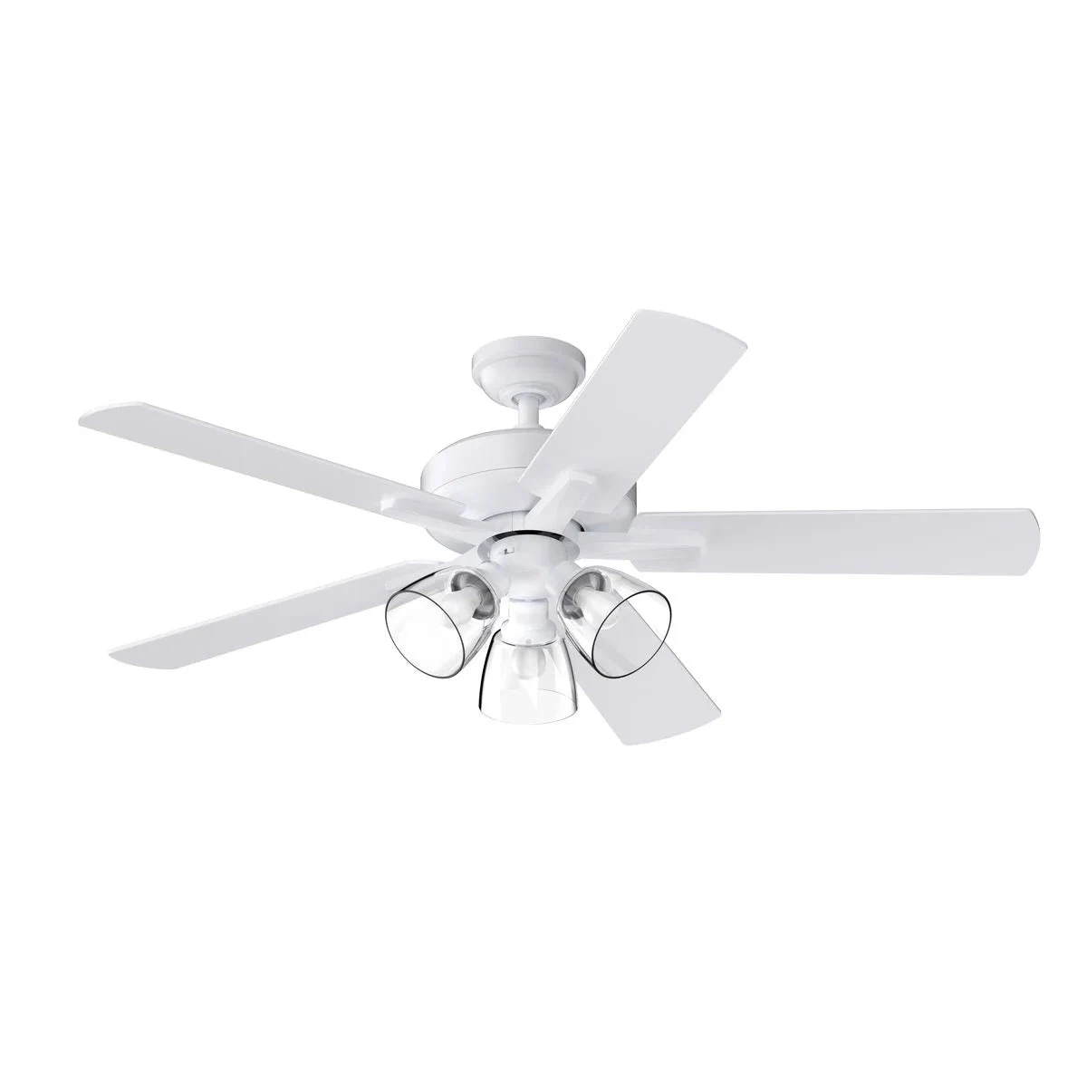 The Better Homes & Gardens Bennett 52″ 3 Light, 5 Blade Ceiling Fan in White with Reversible Blades is the perfect addition to transitional spaces, serving up both powerful air flow and a fresh take on a classic style. With three pull-chain adjustable speed settings, this down rod fan is sure to deliver a high quality, quiet performance while saving energy both in the summer and winter months. It is very easy to install and can be mounted on a sloped ceiling. It includes three dimmable LED bulbs bright illumination through clear, bell-shaped shades. Each of the five blades is reversible, offering a choice between trendy Driftwood and classic Walnut, both equally complementing the White housing finish. This fan’s size makes it a perfect match for any large to medium size living space such as great rooms and bedrooms.