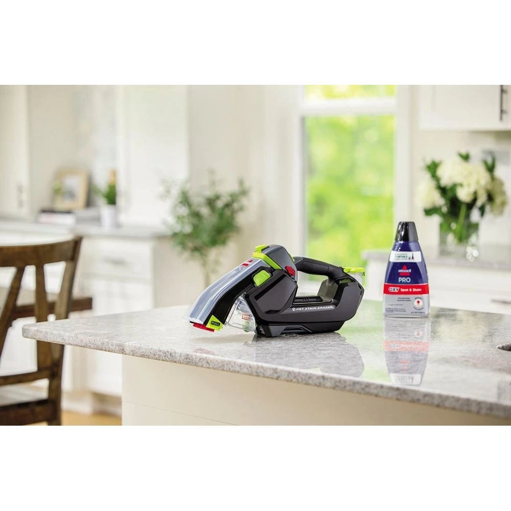 BISSELL® Pet Stain Eraserâ„¢ Plus cordless portable carpet cleaner is ready to tackle tough pet messes whenever, wherever, making it the perfect stain remover for families with little mess makers. This cordless handheld carpet cleaner loosens, lifts and removes tough pet stains with the convenience of a lithium-ion battery. Unlike other spot carpet cleaners, this machine allows you to store the formula in the tank when it’s not in use.