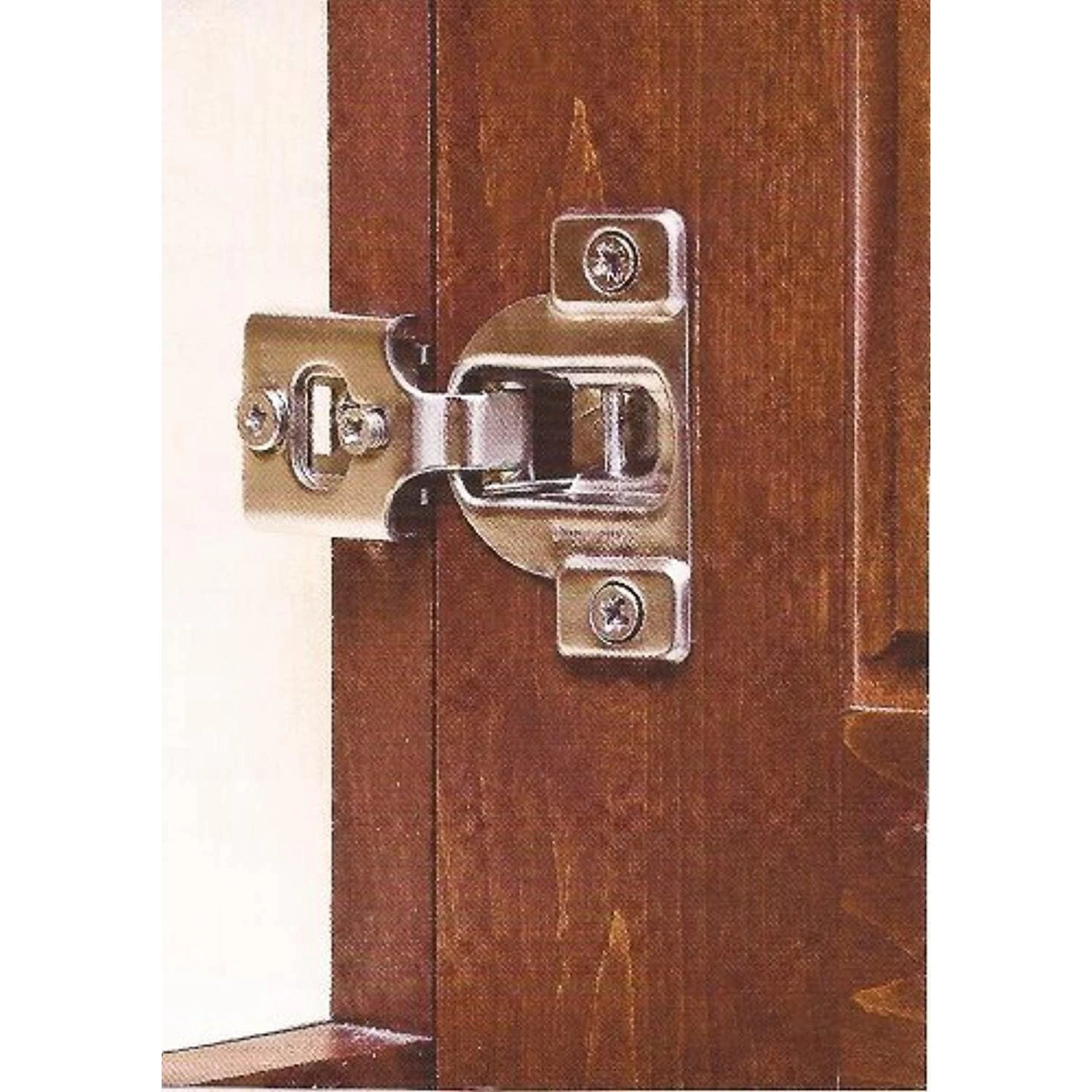 One piece compact assembly with vertical screw adjustment, horizontal cam adjustment, and depth cam adjustment. Cold rolled construction with nickel plating. # 6 x 5/8″ pan washer head screws Included. Four mounting prongs securely wrap around the face frame.