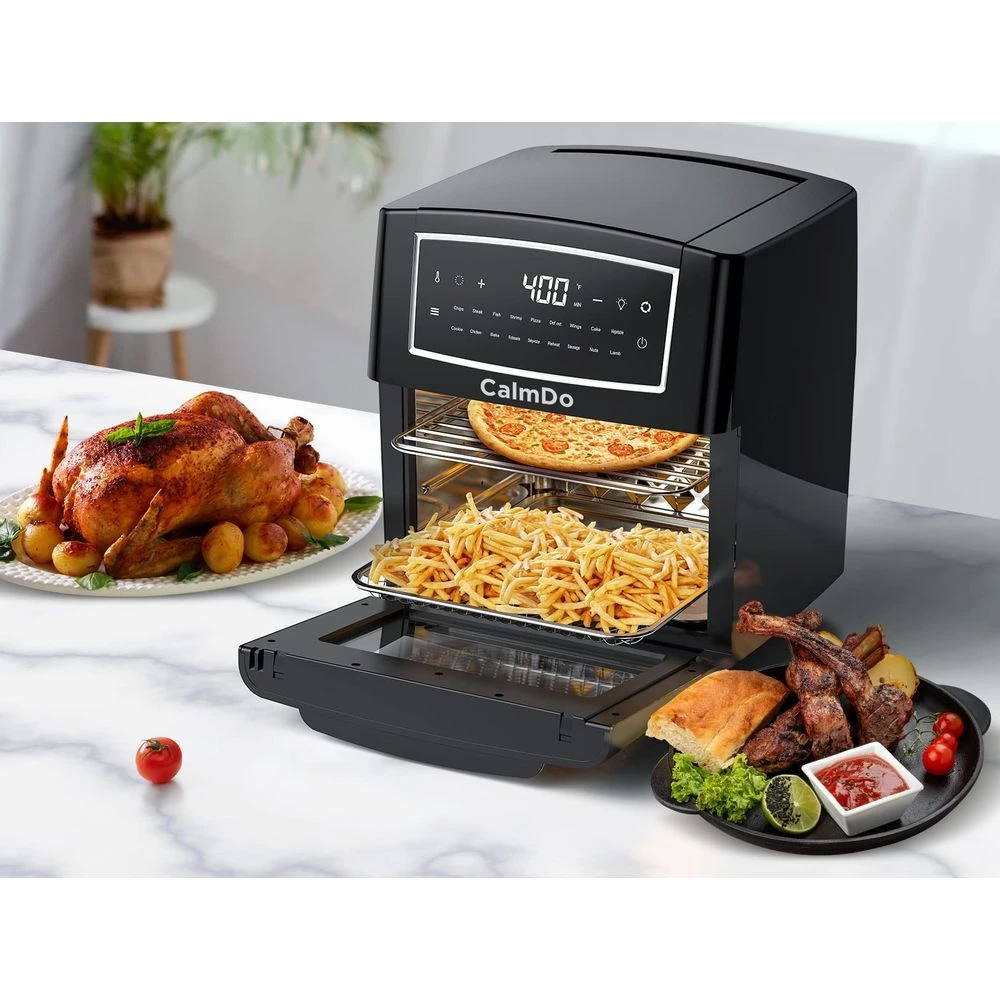 18 Cooking Functions: CalmDo 18 in 1 countertop convection oven is not only an air fryer but also a rotisserie, dehydrator, pizza grill, and toaster oven combo, it has a wide temperature range from 150? to 400? which allows you to air fryer, bake, broil, dehydrate and rotisserie.