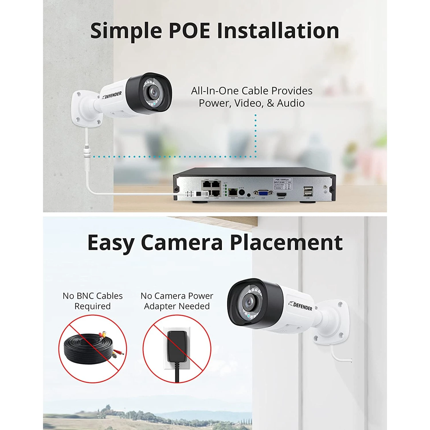 - Power Over Ethernet – Single Wire Camera Connection: Streamline your installation with a simple single cable camera connection using a power over ethernet (POE) connection. Our kits provide you with everything you need for a convenient and reliable wired security system.