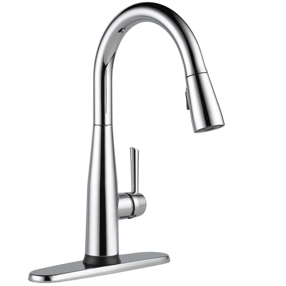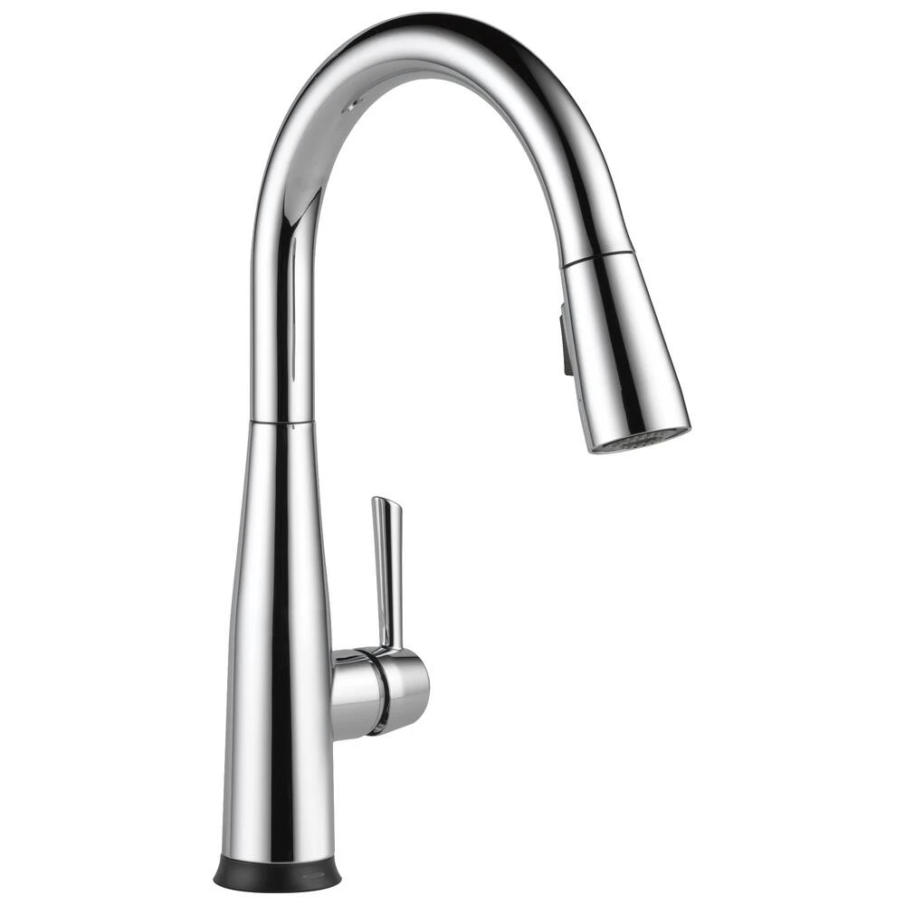 This Essa Touch2O Technology Single-Handle Pull-Down Sprayer Kitchen Faucet in Chrome with MagnaTite Docking features a soft contemporary take on a euro design, with contemporary and transitional elements. Thoughtfully designed to make kitchen tasks easier, Touch2O Technology allows you to turn the faucet on and off with just a touch anywhere on the faucet’s spout or handle. Easily control and change the water temperature above the deck using the faucet handle. TempSense Technology measures the water temperature in the faucet. The LED light at the base of the faucet changes from blue to magenta to red depending upon the temperature of the water to let you know when the water temperature is right for you. A/C adapter EP73954 is available to purchase separately as an option to avoid changing batteries. Even if the adapter is used, batteries are still recommended as a back-up if power goes out. Once power is restored, the solenoid valve will automatically revert back to using A/C power. The pull-down spray wand comes free with a gentle tug and is fed by gravity to extend and retract without friction points. As you raise the wand to dock it, the magnet embedded in the spout pulls the wand precisely into place. MagnaTite keeps your pull-down faucet looking picture-perfect. Delta’s exclusive DIAMOND Seal Technology uses a valve with a tough diamond coating. InnoFlex PEX waterways keep water inside the faucet out of contact with potential metal contaminants.