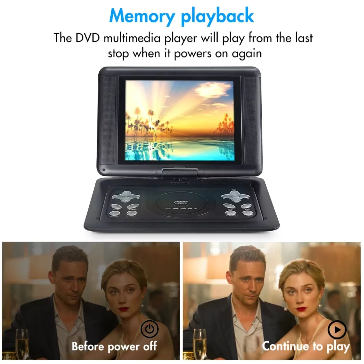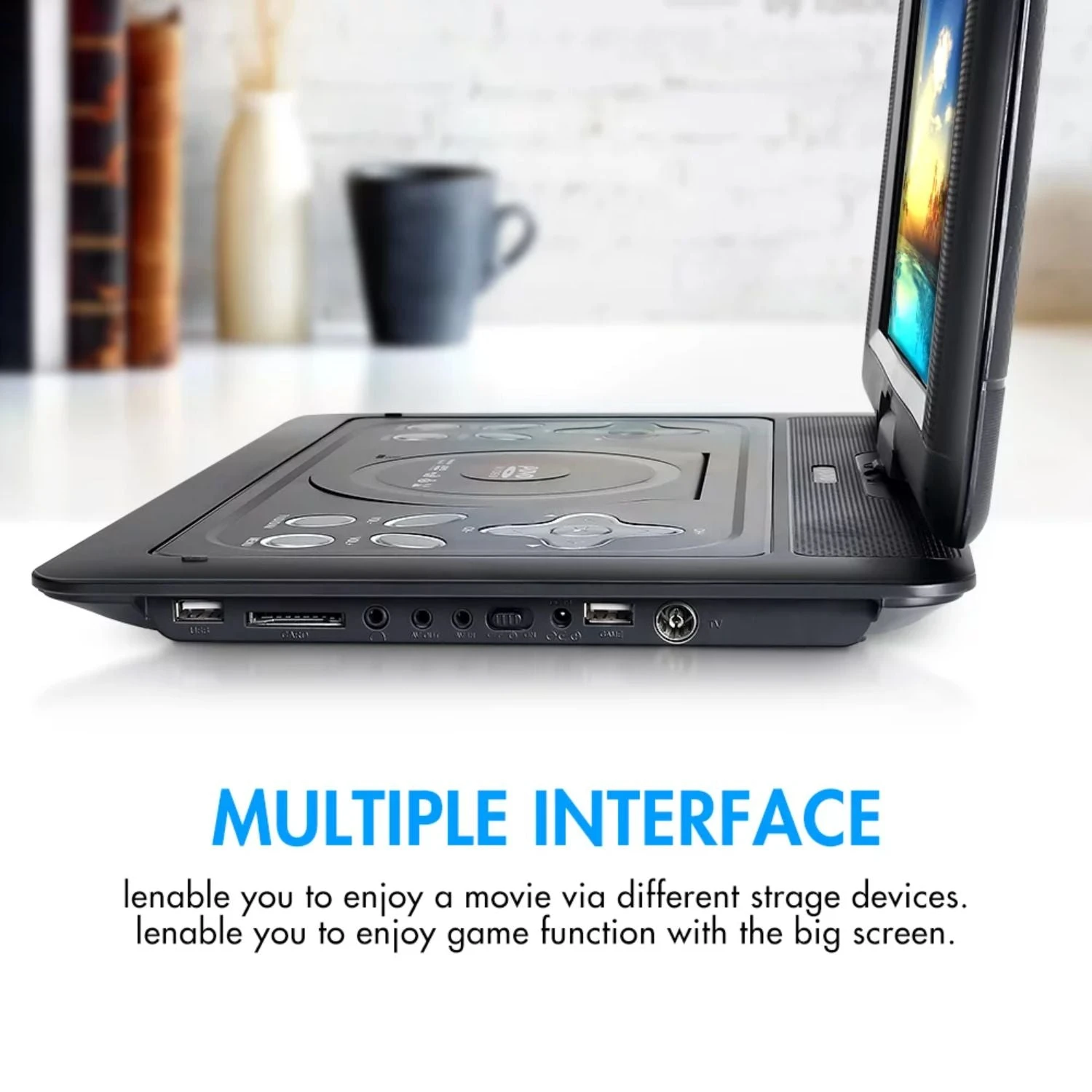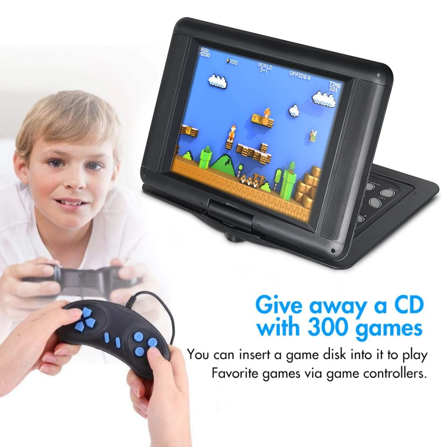 Features: Fully compatible with AVI EVD DVD, SVCD, VCD, CD, CD-R/RW and MPEG-4 format and JPG picture format.18.8 inch high-definition LCD widescreen, rotating 270 degrees.Hundreds of channels can be preset and cable TV channels can be easily received (only analog TV is supported, digital TV is not supported).You can connect the product to a TV and high-quality sound in order to enjoy high-quality movies. It can also be connected to an external video, such as a camera or ordinary DVD.Built-in card reader: you can read movies/pictures/music directly from SD/MMC cards and USB disks.6Built-in stereo speakers, support earphone output. Built-in 3D audio processing, support FM radio functionSupport the language setting of CD menu playback (English, French, Spanish, Chinese, Japanese, Korean, Russian, Thai)Built-in large-capacity rechargeable lithium battery. Equipped with on-board power supply, convenient for on-board use.DVD Player Specifications:Specification:Product type: Portable DVD PlayerMaterial: ABSScreen size: 13inRotary angle: 270TV channel: Hundreds of TV channelsTV signal: Cable TV, wireless TVAV in/out: SupportGame function: SupportUSB port: SupportMultiple sources: A U disk, SD/MS/MMC cardPW cut memory: SupportFM radio: SupportGame playing: SupportBattery capacity: 850mAhInput voltage: 110-240VPlug: US plugPackage size: approx. 60 * 45 * 9 cm/ 23.6 * 17.7 * 3.54 inPackage weight: 2200g/ 77.6ozPackage List:1 * Portable DVD Player1 * Power Adapter1 * Audio Cable1 * Car Charging Cable1 * Game Controller1 * Game Disk1 * Remote Controller1 * Antenna1 * User Manual