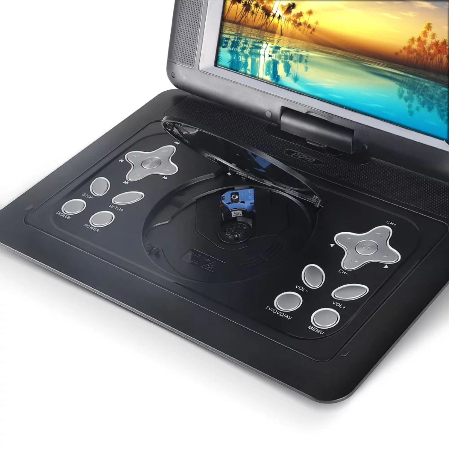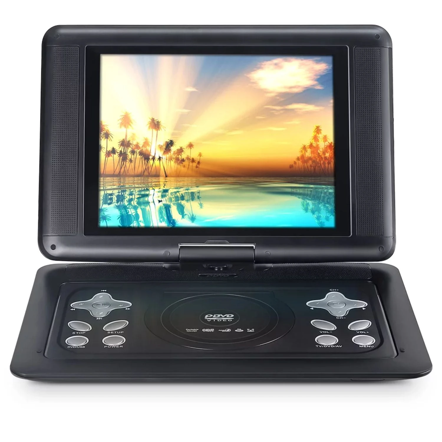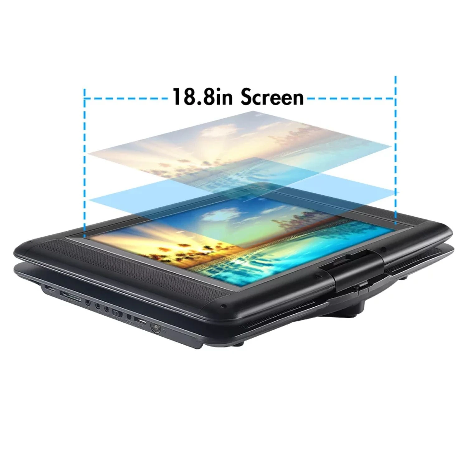 Features: Fully compatible with AVI EVD DVD, SVCD, VCD, CD, CD-R/RW and MPEG-4 format and JPG picture format.18.8 inch high-definition LCD widescreen, rotating 270 degrees.Hundreds of channels can be preset and cable TV channels can be easily received (only analog TV is supported, digital TV is not supported).You can connect the product to a TV and high-quality sound in order to enjoy high-quality movies. It can also be connected to an external video, such as a camera or ordinary DVD.Built-in card reader: you can read movies/pictures/music directly from SD/MMC cards and USB disks.6Built-in stereo speakers, support earphone output. Built-in 3D audio processing, support FM radio functionSupport the language setting of CD menu playback (English, French, Spanish, Chinese, Japanese, Korean, Russian, Thai)Built-in large-capacity rechargeable lithium battery. Equipped with on-board power supply, convenient for on-board use.DVD Player Specifications:Specification:Product type: Portable DVD PlayerMaterial: ABSScreen size: 13inRotary angle: 270TV channel: Hundreds of TV channelsTV signal: Cable TV, wireless TVAV in/out: SupportGame function: SupportUSB port: SupportMultiple sources: A U disk, SD/MS/MMC cardPW cut memory: SupportFM radio: SupportGame playing: SupportBattery capacity: 850mAhInput voltage: 110-240VPlug: US plugPackage size: approx. 60 * 45 * 9 cm/ 23.6 * 17.7 * 3.54 inPackage weight: 2200g/ 77.6ozPackage List:1 * Portable DVD Player1 * Power Adapter1 * Audio Cable1 * Car Charging Cable1 * Game Controller1 * Game Disk1 * Remote Controller1 * Antenna1 * User Manual