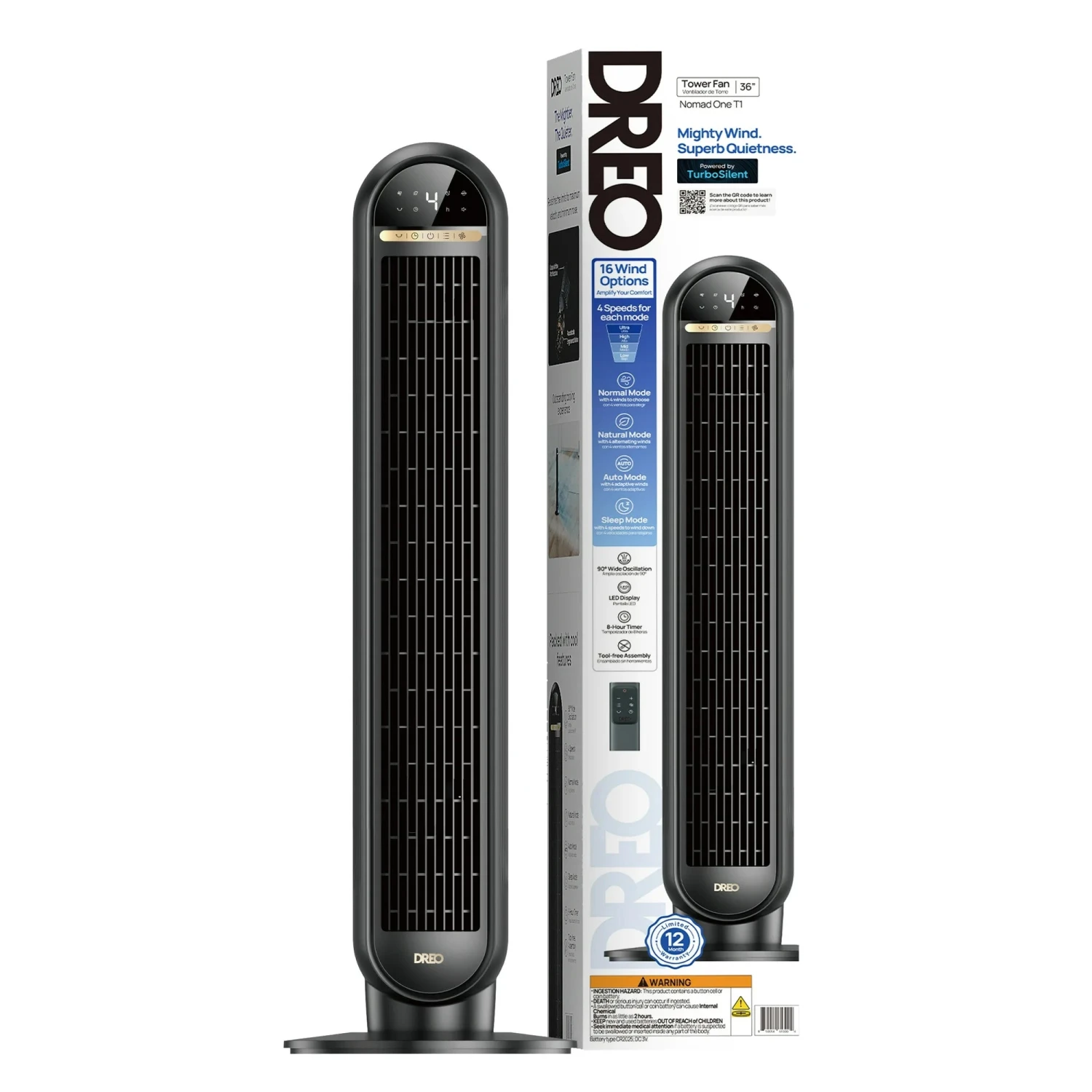 Dreo New 36-in Standing Tower Fan with Remote, 90° Oscillation, LED Display, 4 Speeds, 4 Modes, 8H Timer, Quiet The Dreo Electric Tower Fan has a compact design that you can easily carry to your bedroom, living room or elsewhere. The standing fan can provide a velocity of 24ft/s, effectively distributing airflow throughout the room. With 4 fan speeds and 4 modes, the 90° oscillating cooling fan enhances air circulation through your space. This bladeless fan adopts a unique air-duct design with fluid mechanics and minimizes noise. Certified by ETL, this fan works safely without supervision. The quiet oscillating bladeless fan is powerful for the Home, Bedroom, Office, or Indoor Room.