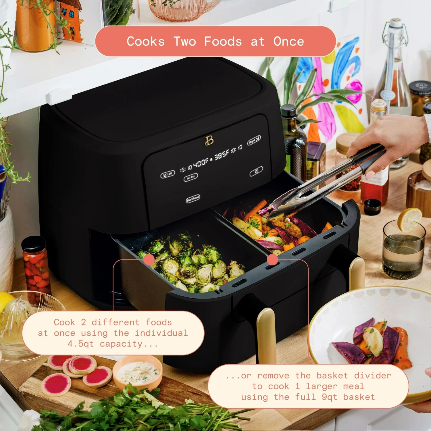 - Cook 2 different foods at once using the individual 4.5qt capacity cooking zones or remove the basket divider to cook 1 larger meal using the full 9qt basket