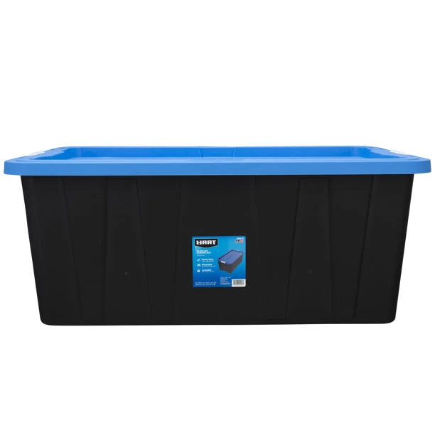 The HART 40-Gallon Heavy-Duty Plastic Storage Tote Box, Black base/Blue Lid, Set of 3, provides you with an easy storage and organization solution to reduce clutter and increase space in your home. Made of extremely durable plastic (polypropylene), the strong rigid walls of the storage tote are stackable to maximize storage space and to stay sturdy when stacked. The deep 1 inch recessed lid design helps keep totes secure and prevent tipping when stacked. The tough plastic material protects your valuables and keepsakes from dust, dirt, bug, and water damage in a stylish way.