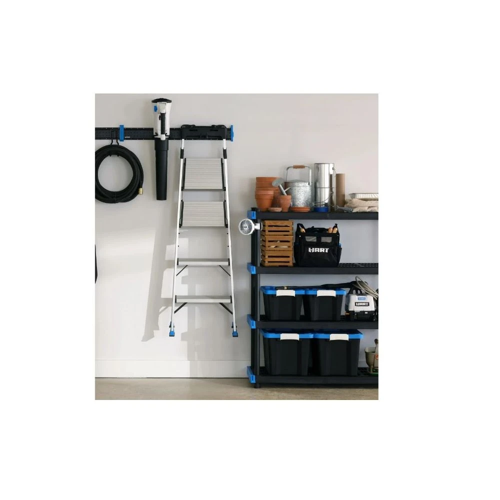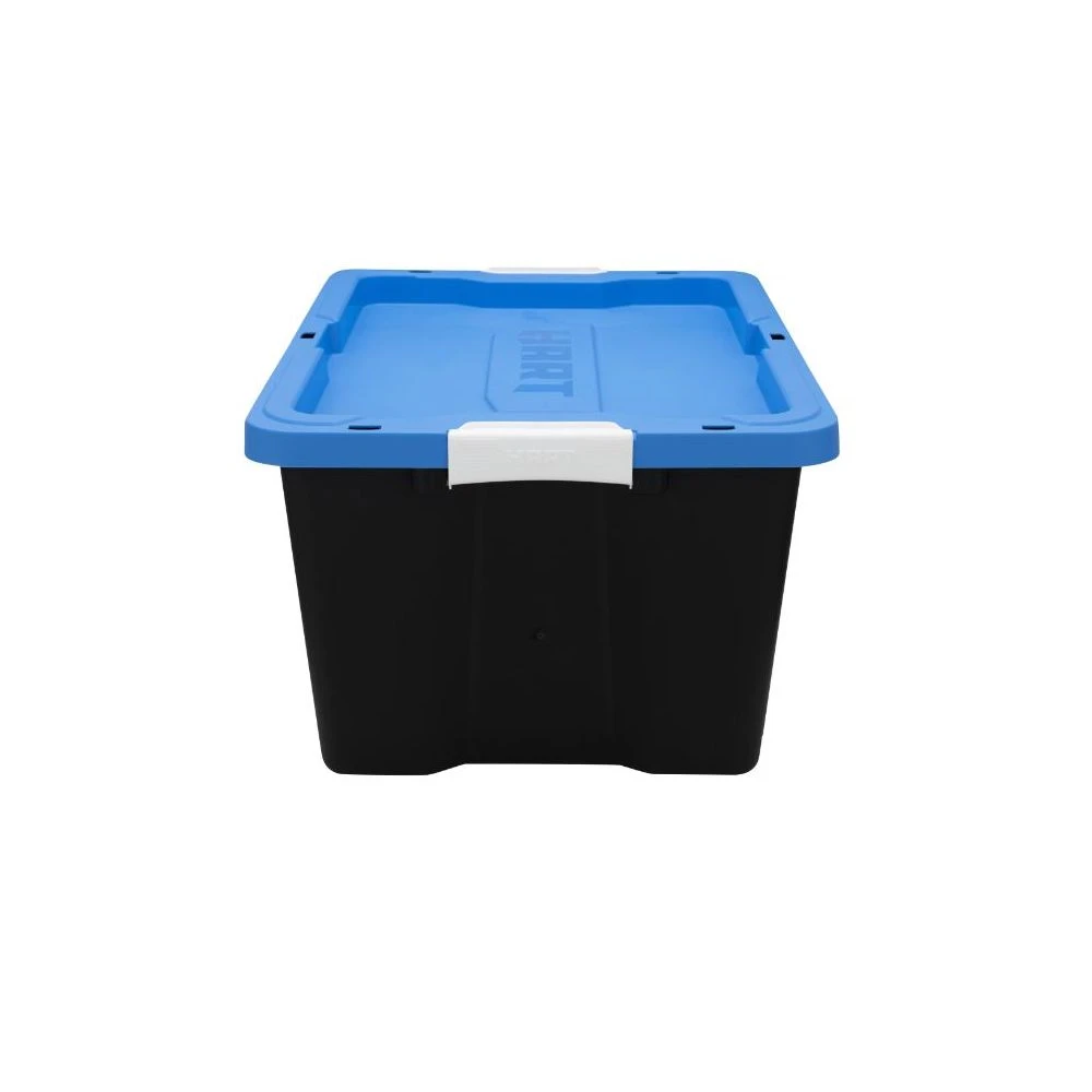 The HART 17-Gallon Heavy Duty Latching Plastic Storage Box, Black base/Blue Lid, Set of 4 provides you with an easy storage and organization solution to reduce clutter and increase space in your home. Made of extremely durable plastic (polypropylene), the fluted rigid walls of the storage tote are designed to be strong and stackable to maximize storage space and to stay stable when stacked. The recessed lid design helps keep totes secure and prevent tipping. The two tough latching white grip handles make it easy to transport or use for moving valuable around while keeping items secure. The compact 17-gallon size is great when needing to store heavier items or on higher shelfs. For added measure, the storage tote includes 4 large holes around the edge to keep items safe using zip-ties or padlocks.