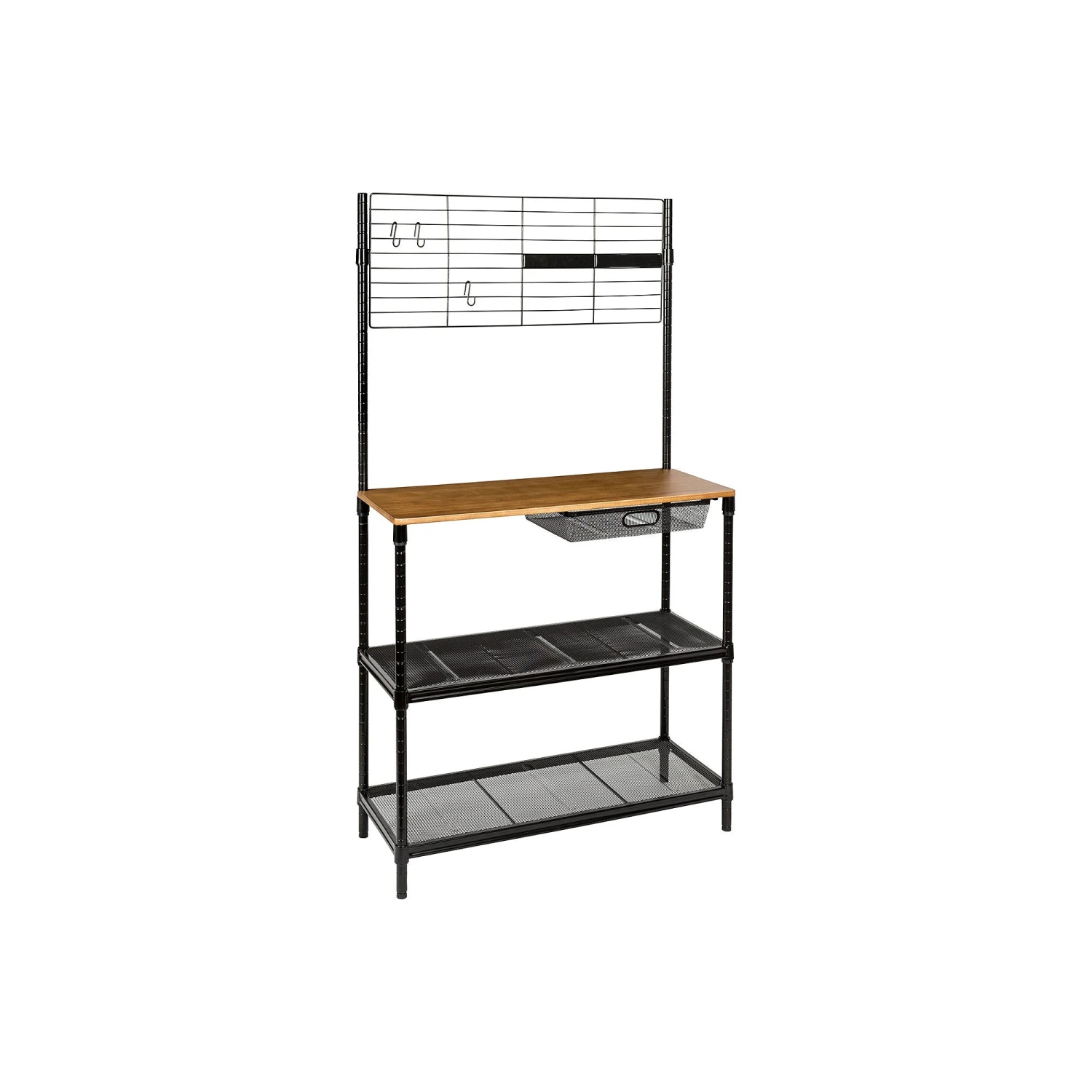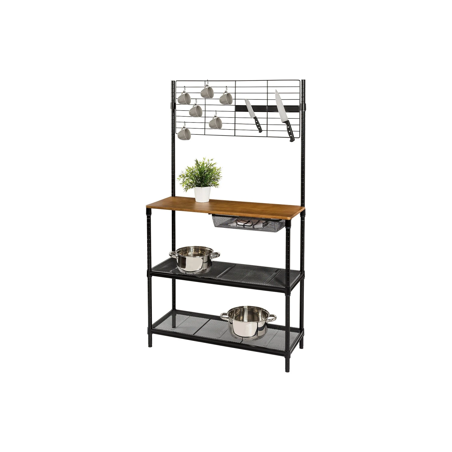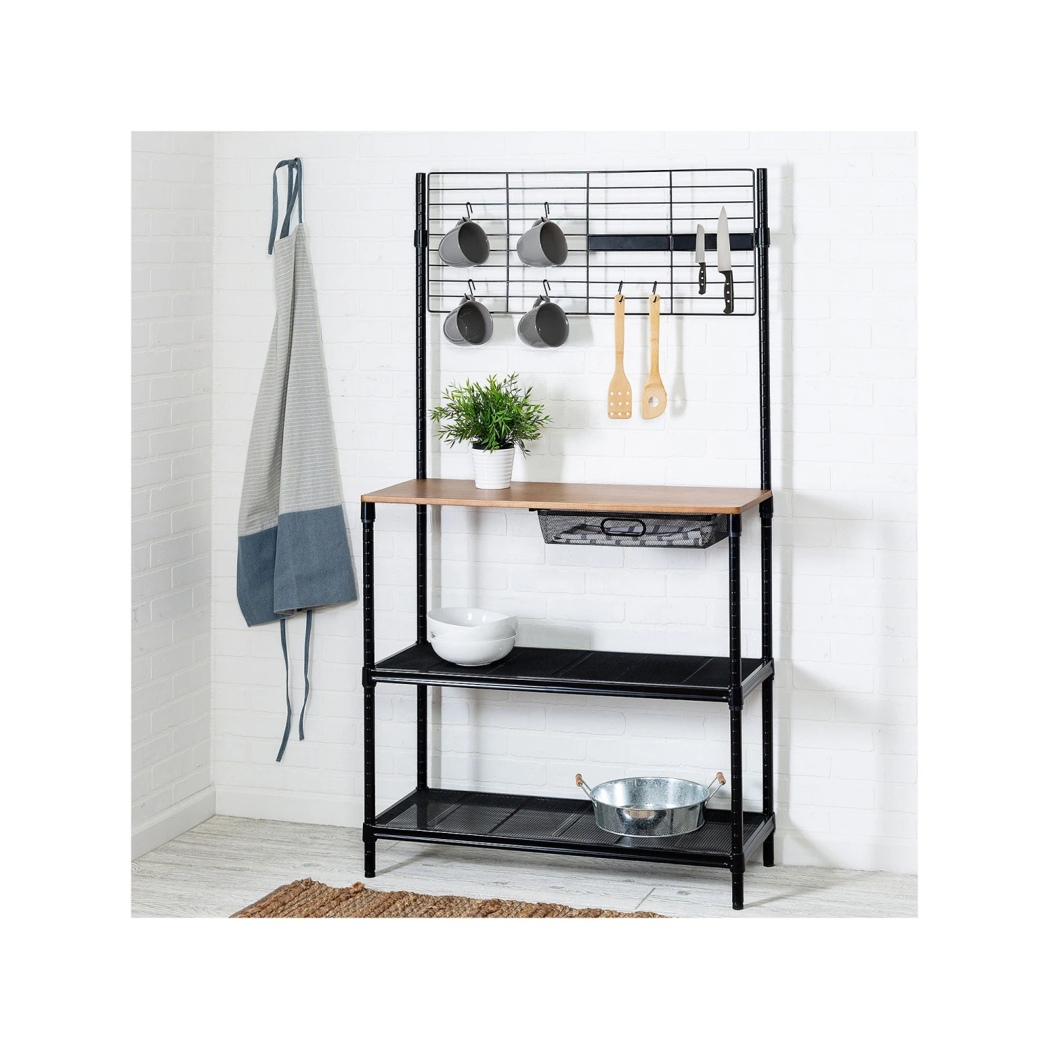 You have a limited number of kitchen cabinets and shelves, so this bakers rack comes in handy as a jack of all trades and its look adds to your kitchen design. Use the tabletop as a cutting board and hang everything from reminders to kitchen tools to keep them within reach. Its pull-out basket is perfect for kitchen tools and its durable steel frame will have this bakers rack keeping you company in your kitchen for years to come.