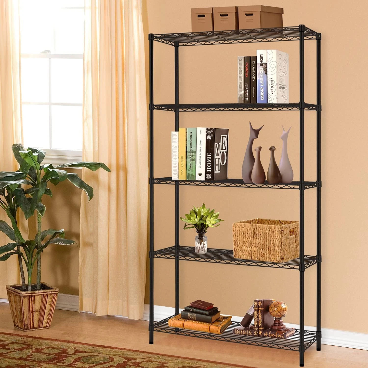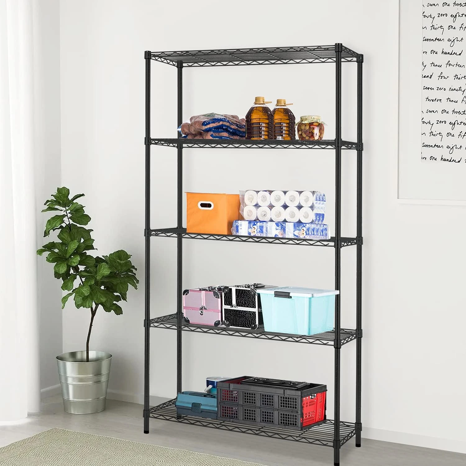 - WIDELY APPLICABLE – The utility shelves are suitable for many places such as storage rooms closets warehouses basements living rooms offices and so on. Comes with easily adjustable clips to secure and stabilize each shelf. Versatile shelving is perfect for garage shelving kitchen storage and pantry shelving. Specification: Shelf Name: 5-tier storage rack Shelf Material: Steel Shelf Color: Black.