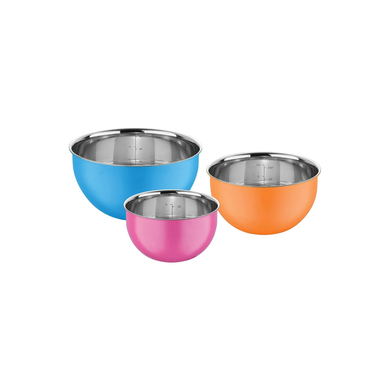 The Mesa Mia 3-piece mixing bowl set is the perfect addition to your kitchen. This set includes a 1.5 qt bowl in cabaret, a 3 qt bowl in russet orange, and a 5 qt bowl in Hawaiian ocean – all made of durable stainless steel and with measurement markings on the inside. With this set, you can easily prepare meals with ease and elegance while accurately measuring ingredients. The vibrant colors are sure to add flair to your kitchen while helping you create delicious dishes! With its smooth surface and sturdy base, these bowls will make all your culinary tasks efficient and enjoyable.