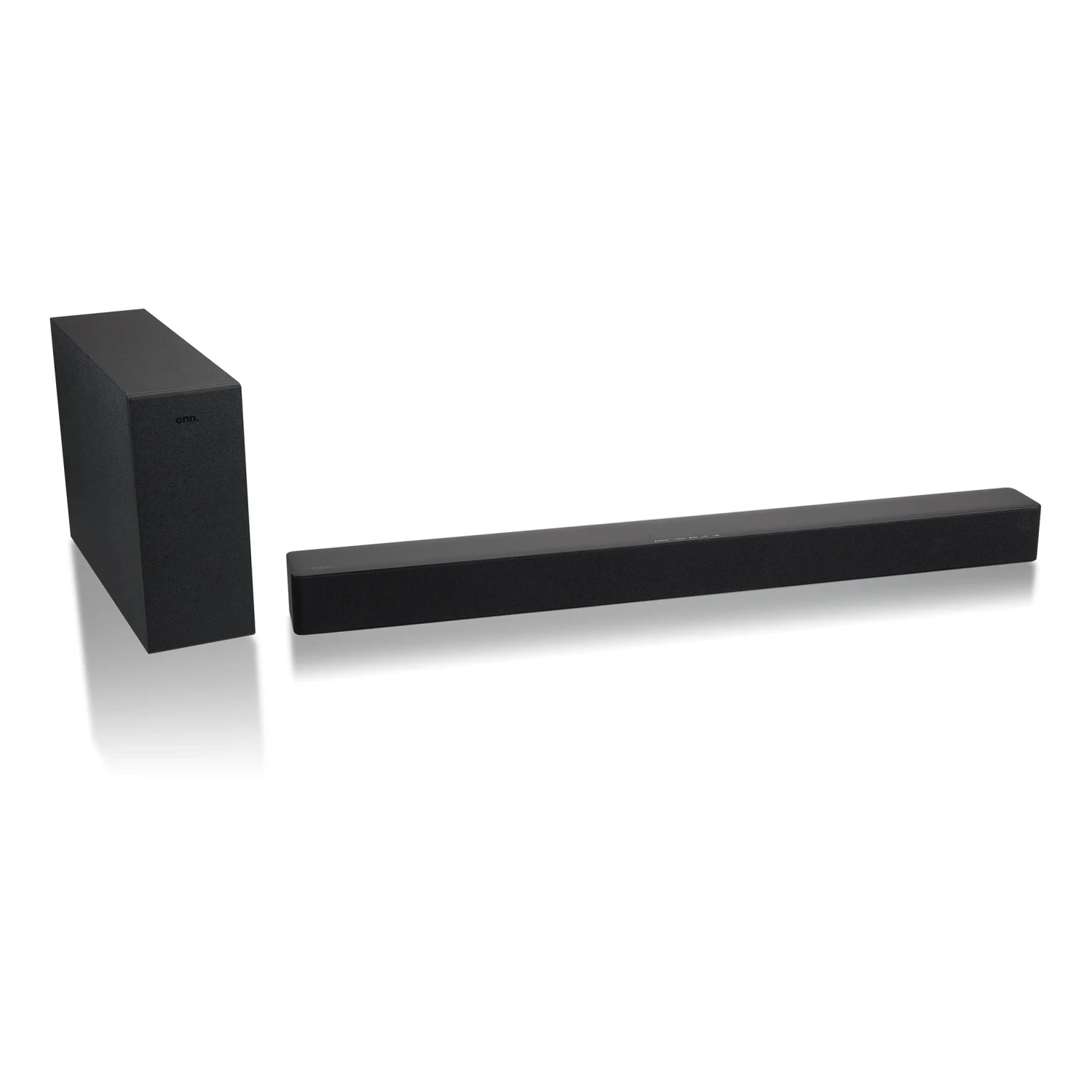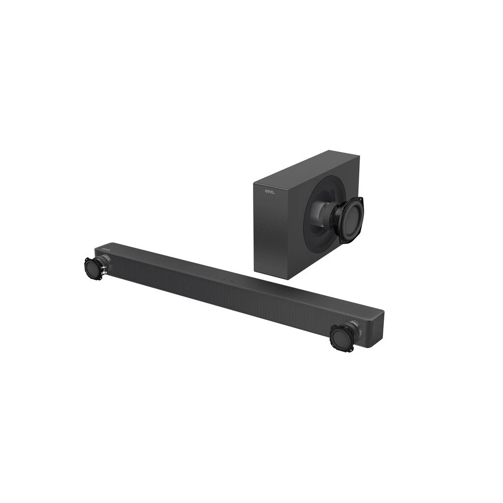 onn. 32″ 2.1 Soundbar with 2 Speakers & Wireless Subwoofer480 W peak powerDolby Audio (supporting Dolby Digital Plus)Simple setup with any TVBluetooth wireless technology streams audio from all your devices2.1 channels2 internal speakers and 1 wireless subwoofer120 W RMS output/480 W peak output (4 x RMS)Connections: HDMI (ARC), Optical, USB, AUX