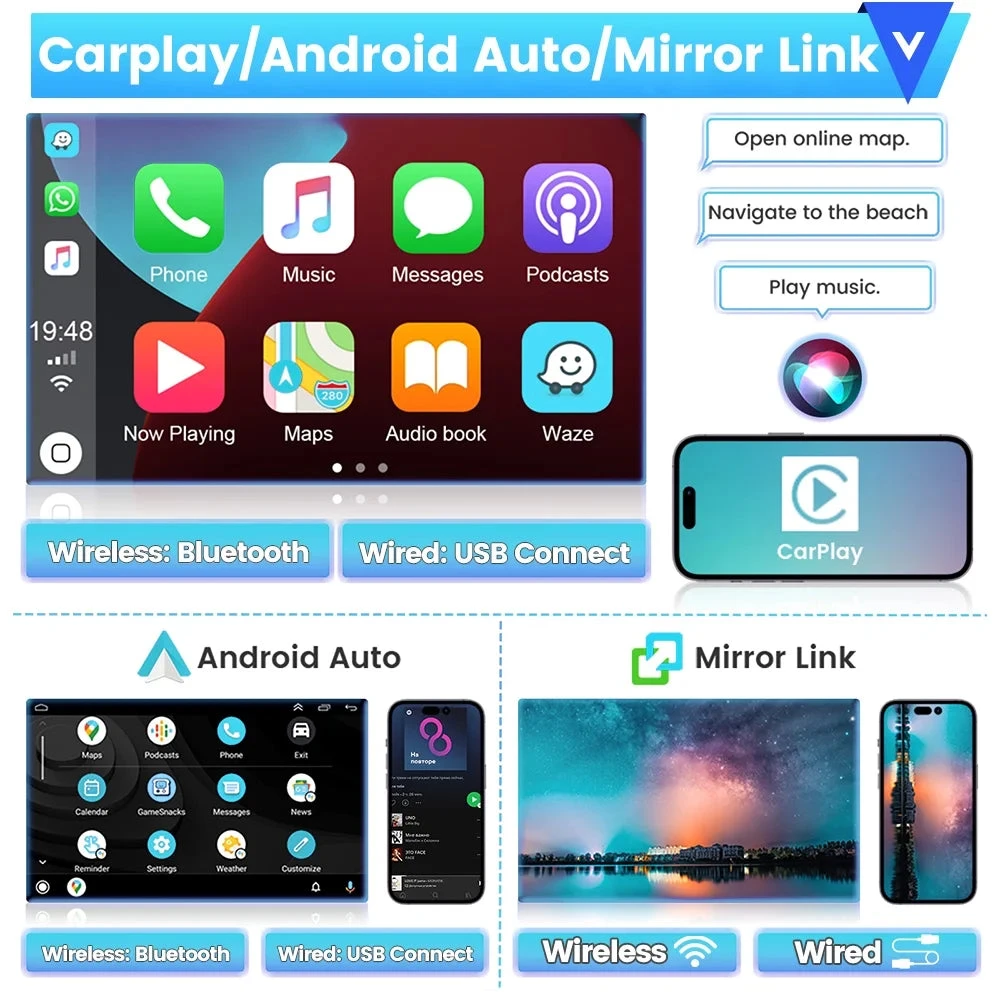 - Wireless/Wired Carplay&Android auto: You can connect the car player with your mobile phone to make calls,access emails,GPS navigation,listen to music,realize voice control ,etc.