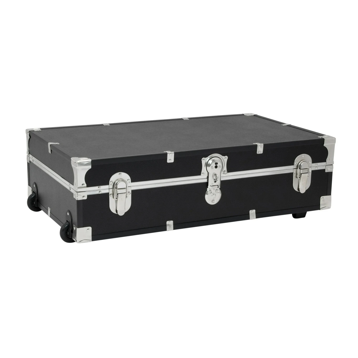Tuck away bulky linens, holiday decorations, keepsakes, or seasonal clothing in the Seward Under the Bed 31″ Trunk. This trunk features classic nickel hardware with black binding and nickel corner guards. The dual lock-down latches and tongue and groove closure help keep dust and moisture out. The push-button center latch has an optional locking feature (includes keys). For additional security, add a padlock. Wheels and a side handle make this trunk easy to move and store.