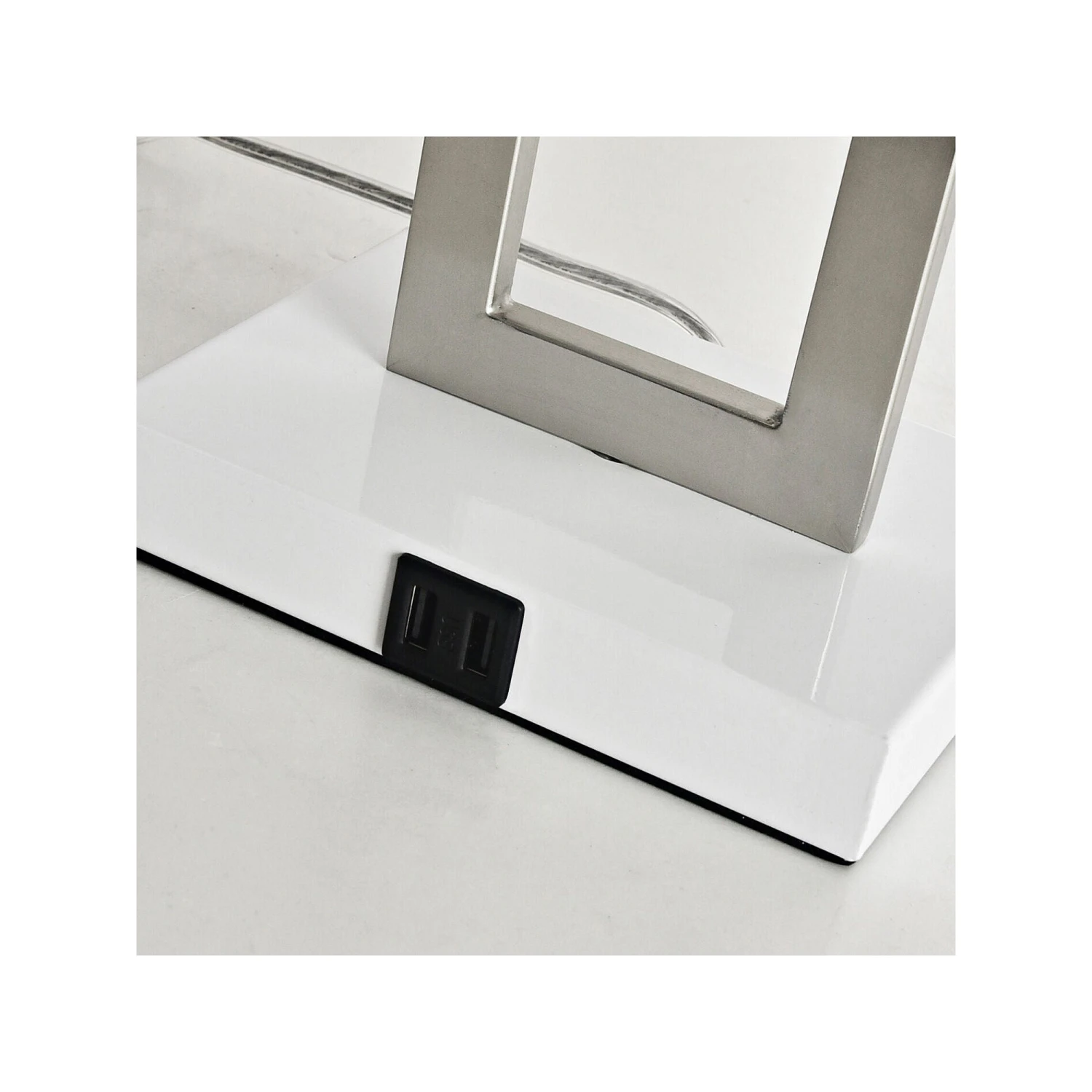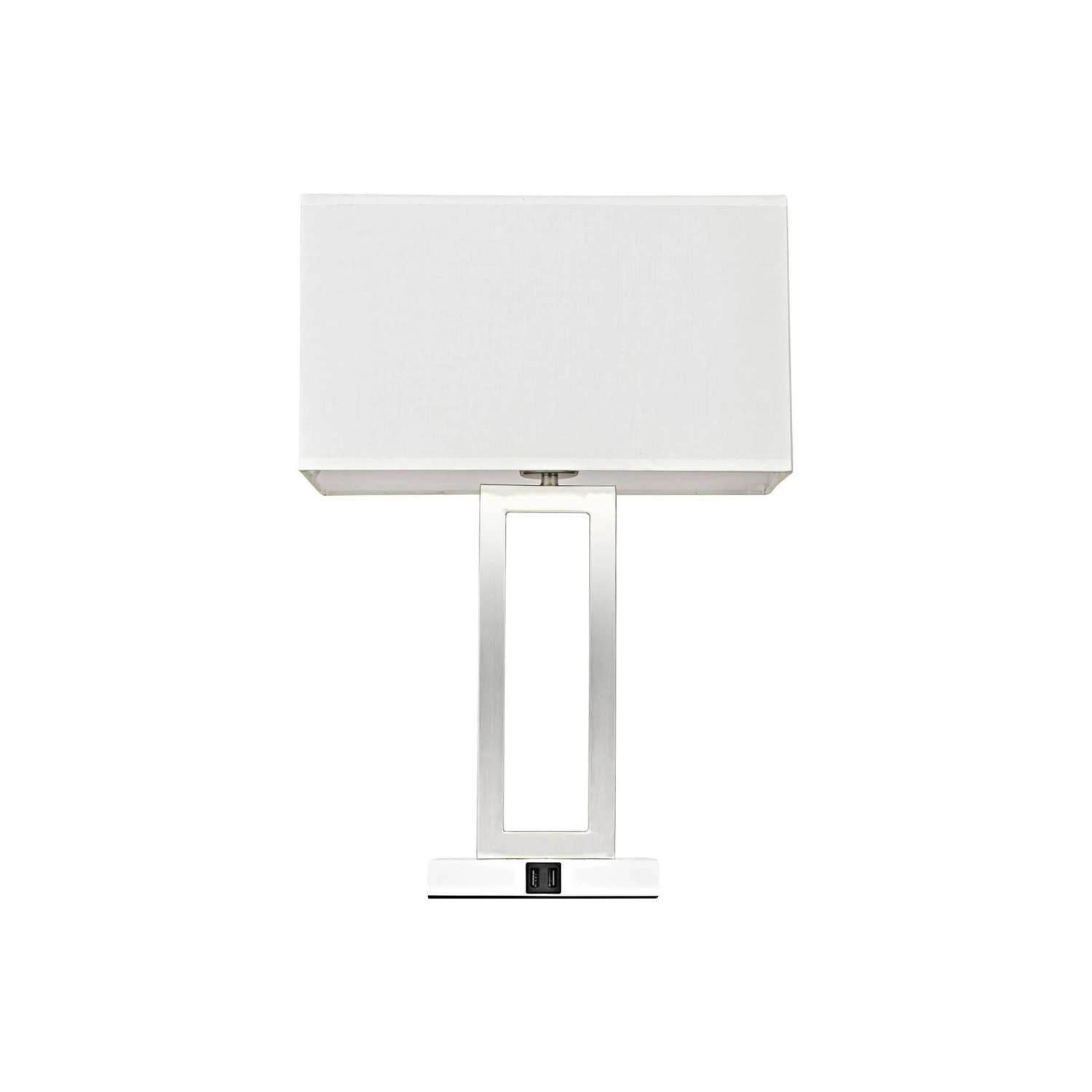 Juliet table lamp with usb ports is a perfect addition to your home. Its functional and stylish. The geometric base and classic white shade make this table lamp a very unique and desirable item. Brushed nickel finish white fabric shade 2 usb2.0. Charging ports a19 8w e26 bulb (included) modern design geometric design installation manual included return policy
