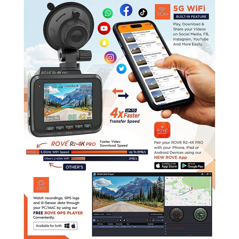 - PAIR YOUR SMARTPHONES WITH ADVANCED 5G WIFI – With our R2-4K PRO dash cam, you can connect your iOS or Android devices using the latest dual band 5G & 2.4GHz WIFI feature. With our advanced ROVE Dash Cam APP, you can easily view, download and share your best videos with your friends and family with just one click on social media or using any messenger. You can even set up all the settings of your dash camera within our app. We provide over-the-air firmware updates using our APP for free.