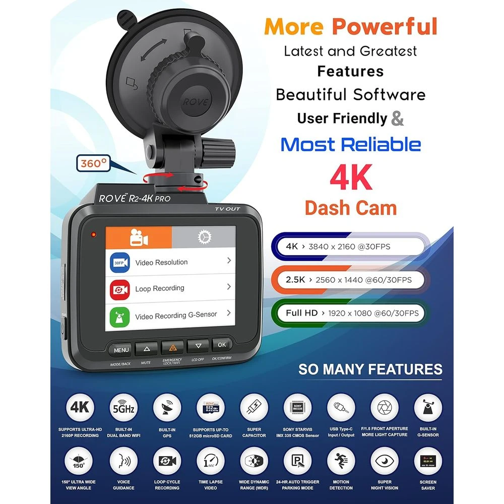 - 4K UHD RECORDING 2160P @30FPS / 2.5K @60FPS – ROVE R2-4K PRO Dash Cams is our newest and most advanced feature-packed super night vision 4k dash cam with all the bells and whistles needed in dashcams for cars this 2023.