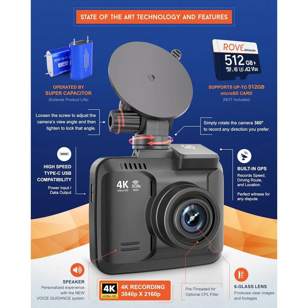 - FEATURES WITH STATE OF THE ART TECHNOLOGY – R2-4K PRO dashboard camera is a supercapacitor car camera (extends product life significantly), voice guidance and alerts, f1.5 aperture (allows more light capture for small details), time-lapse video, 150Degrees wide angle 7-glass lens, emergency video lock, ring of threads for optional CPL filter, loop recording, G-Sensor, supports micro sd card up to 512GB (not Included, recommend ROVE memory card ASIN: B0BGV6W8QX).
