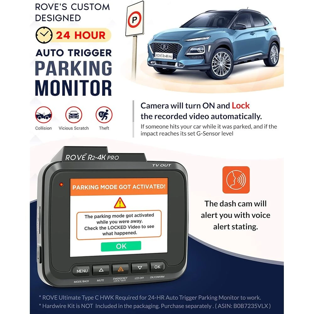 - Our 24/7 CUSTOM DESIGNED PARKING MODE: R2-4K PRO offers three options for its custom-designed 24-hour parking mode with voice guidance. 1fps timelapse video, motion detection, and collision detection. Hardwire kit is required (buy separately, ASIN: B0B7235VLX). If an event occurs in the park, then the camera will record a full 1-min video, lock it safely in an event folder, and give you a voice alert the next time you start your car letting you know that event has occurred while you were away.
