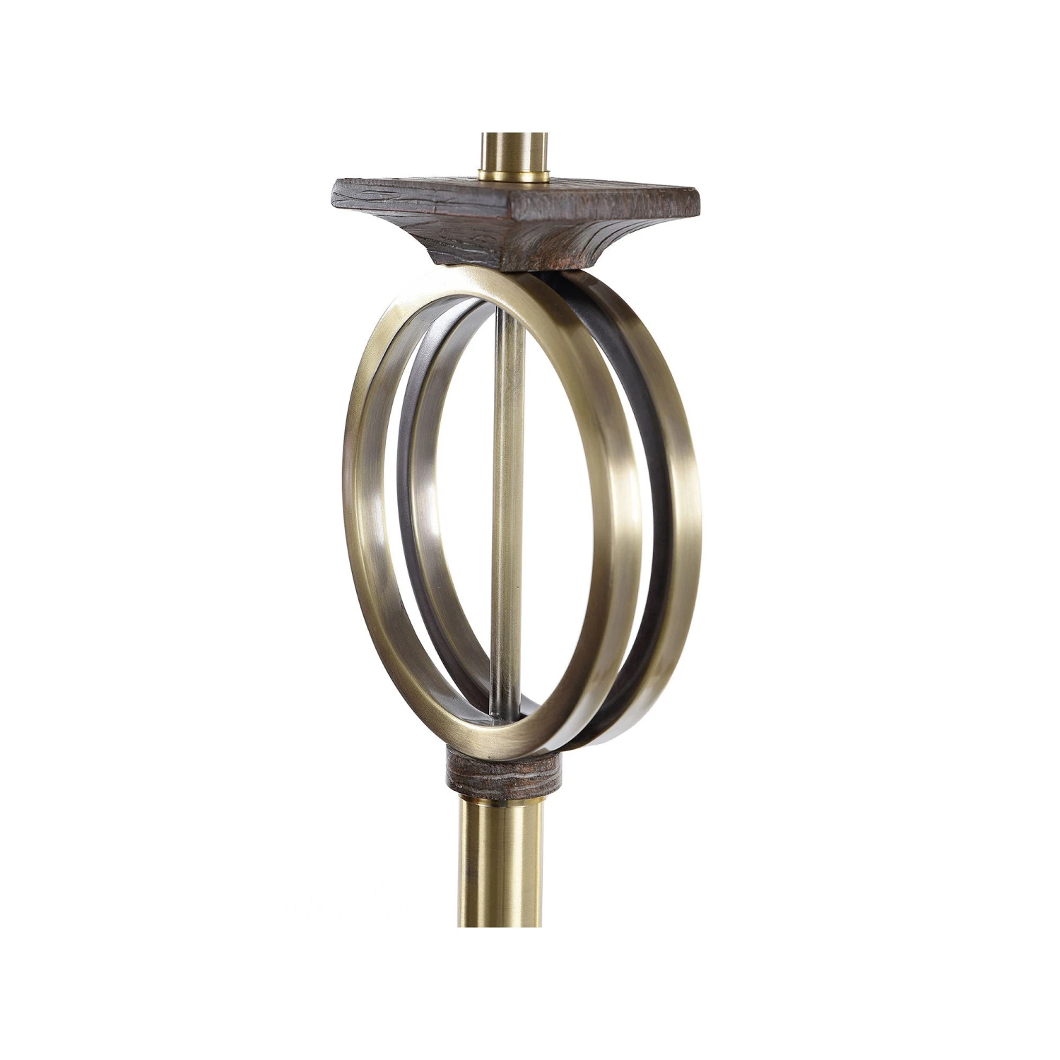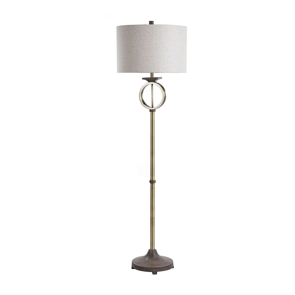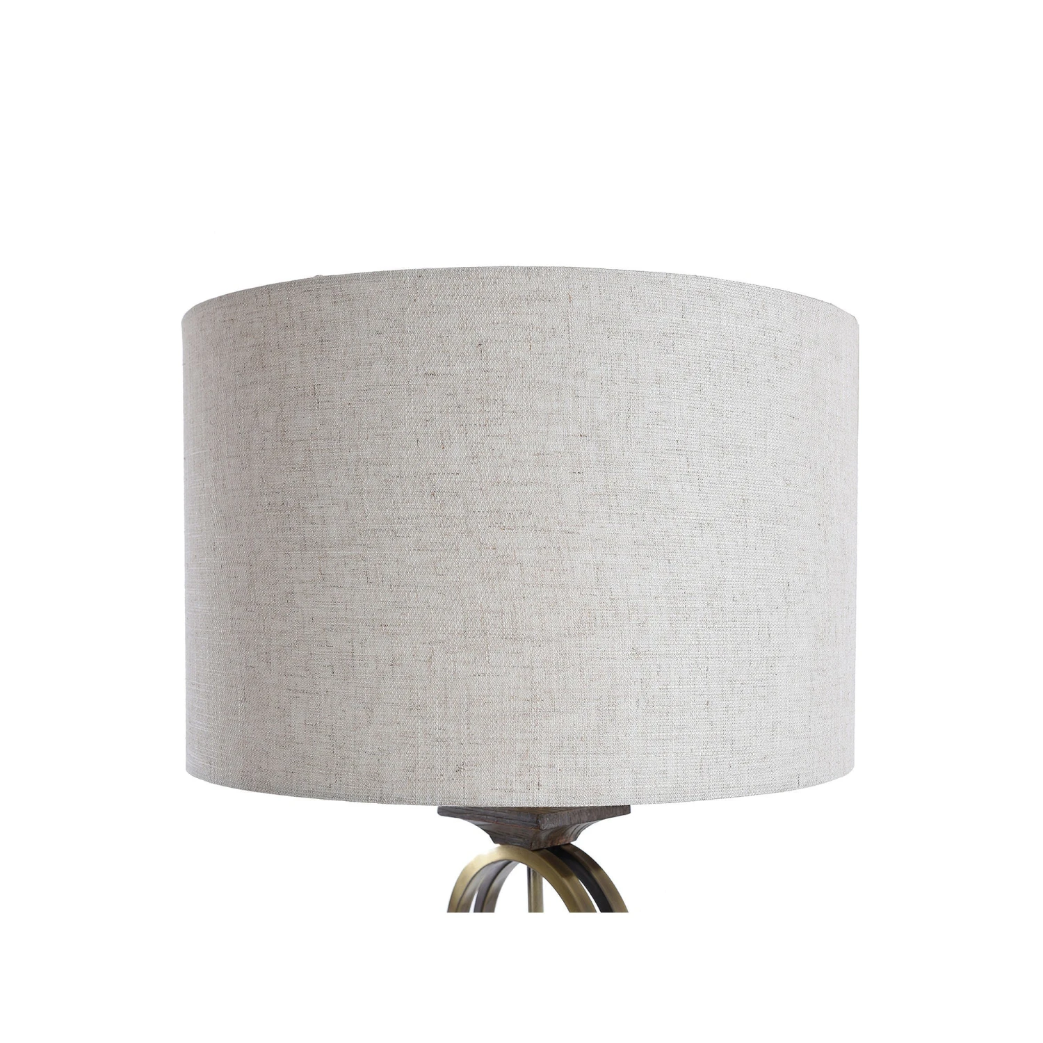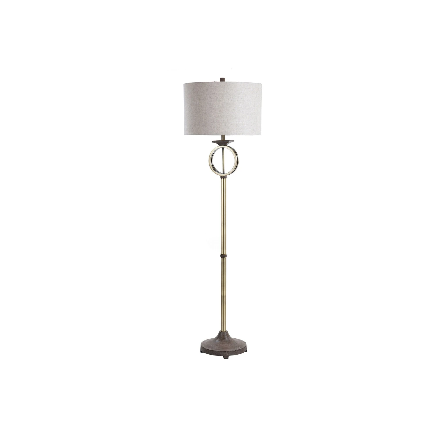 The contemporary Maconfield floor lamp features an off white linen shade over a steel frame with a dark wood-like finish and a ring-shaped brass accent. The intriguing shape of the frame and the lamp’s unique production process ensure it is a one-of-a-kind accent piece. A three-way switch makes this brass and wood floor lamp a stylish and functional addition to a family room or living room.