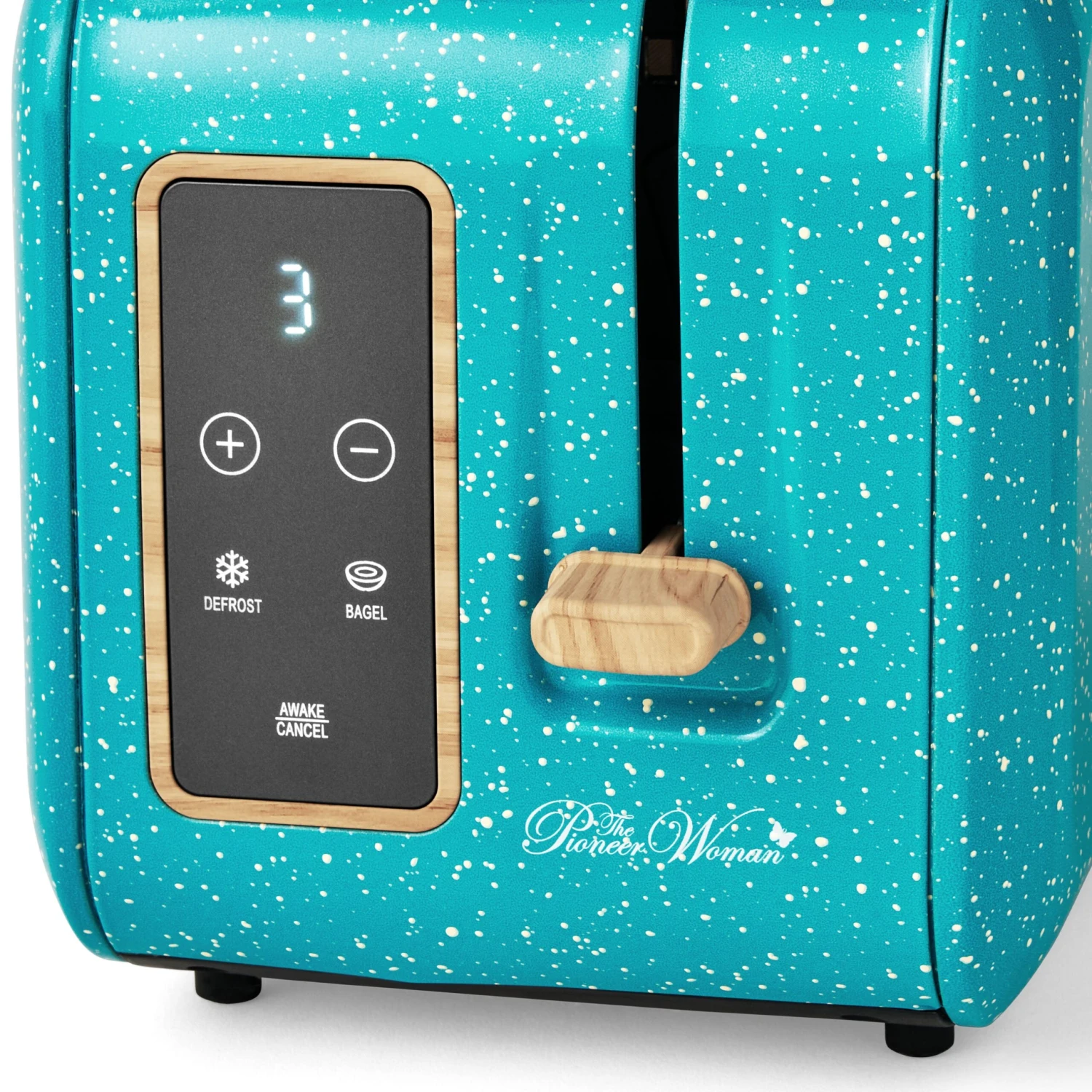 Whether you like your bread slightly warmed or extra crispy, The Pioneer Woman digital 2-slice toaster, Teal Speckle (PW8402550614-02, 2.99lblb) has got you covered. Its touch-activated display has three functions: Cancel, Defrost, and Bagel, make it perfect for toasting bagels, waffles, English muffins, and more. The defrost option conveniently handles some of your favorite frozen breads such as toast and waffles, while the bagel option effortlessly pops out toasted bagel perfection. When your bread is done, this gorgeous toaster’s high-lift boost feature makes it easier to retrieve the bread while keeping your hands safe from the heat. Lastly, its easy-to-read digital display adds a touch of modernity to this stylish toaster.